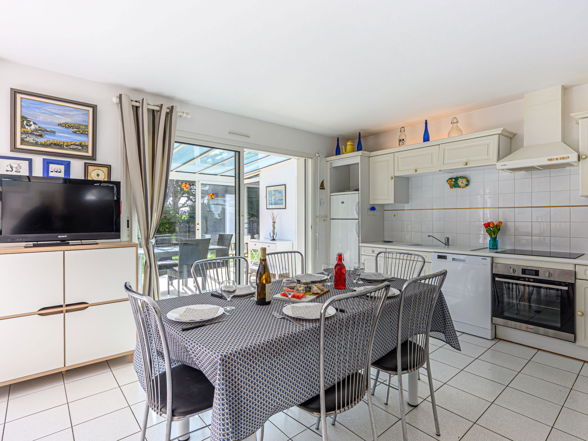 4-room house 120 m2 on 2 levels. Comfortable furnishings: living/dining room with TV (flat screen). 1 room with 1 french bed (1 x 140 cm, length 190 cm), TV (flat screen). Open kitchen (4 hot plates, oven, dishwasher, freezer, electric coffee machine, Capsules for coffee machine (Tassimo) extra). Exit to the veranda. Shower, sep. WC. Upper floor: 2 rooms, each room with 1 french bed (1 x 140 cm, length 190 cm), TV (flat screen). Shower, sep. WC. Electric heating. Terrace, garden. Terrace furniture. Facilities: washing machine. Internet (WiFi, free). Parking. Please note: smoke alarm. 56234 000208 5B