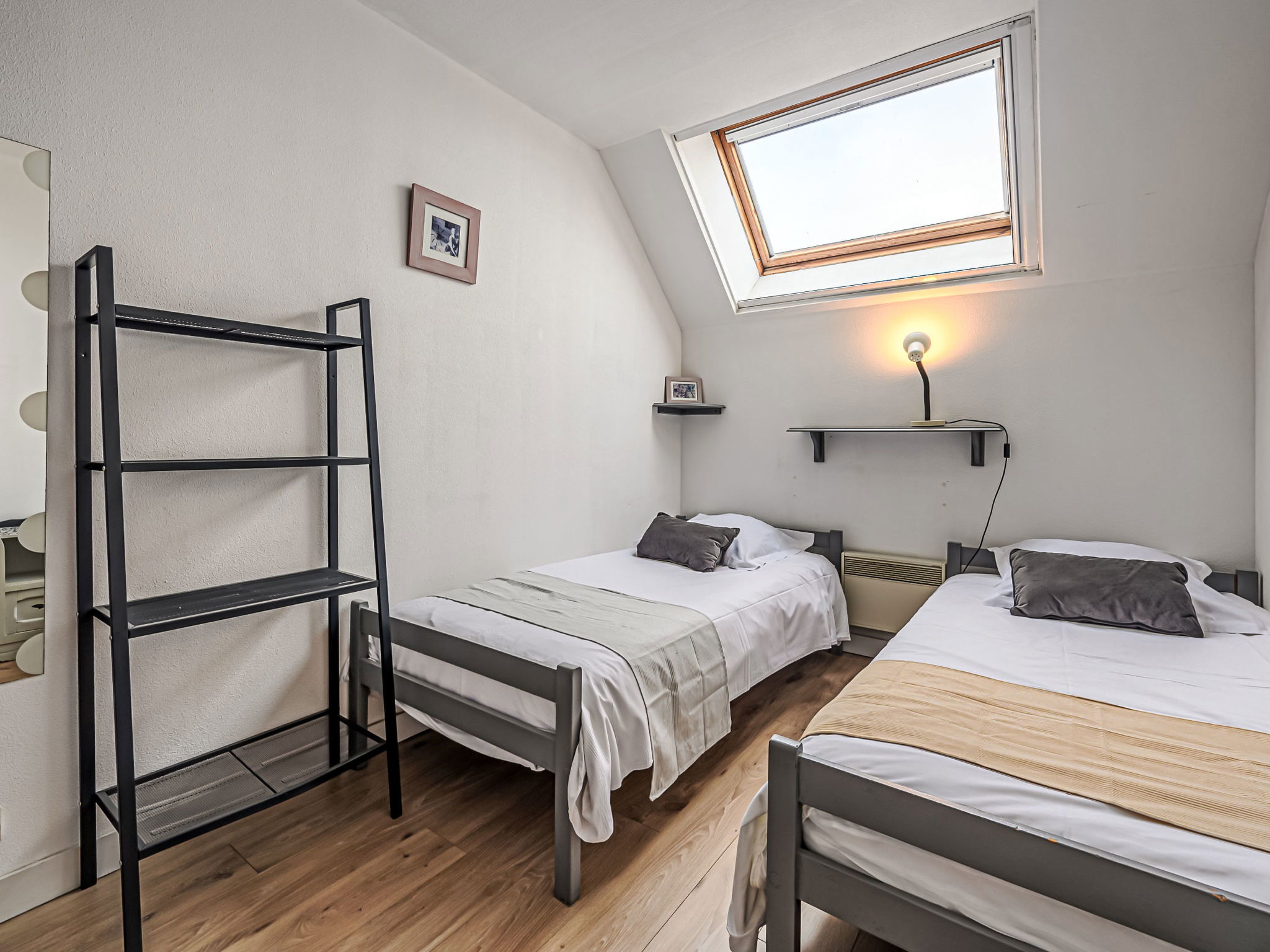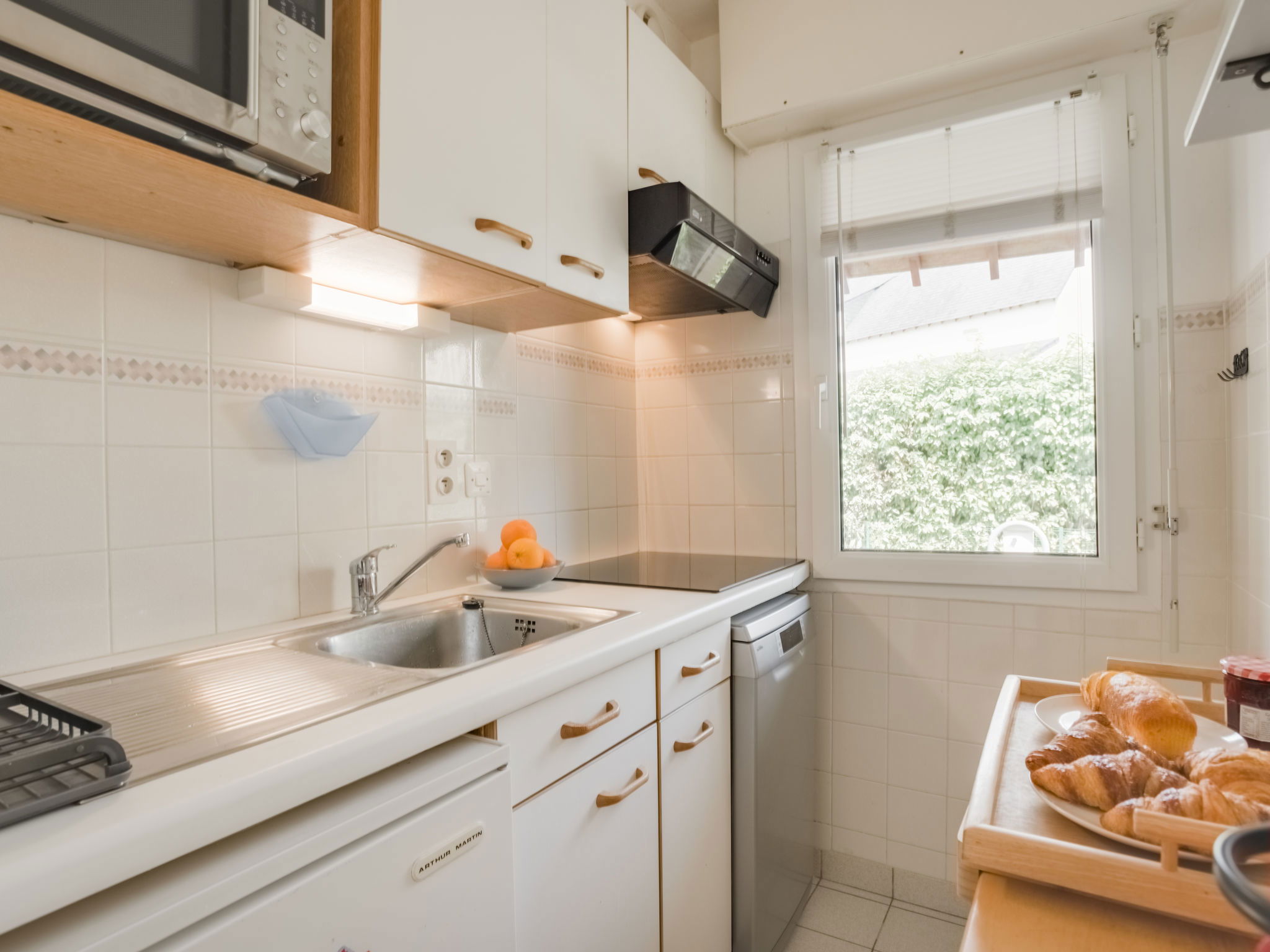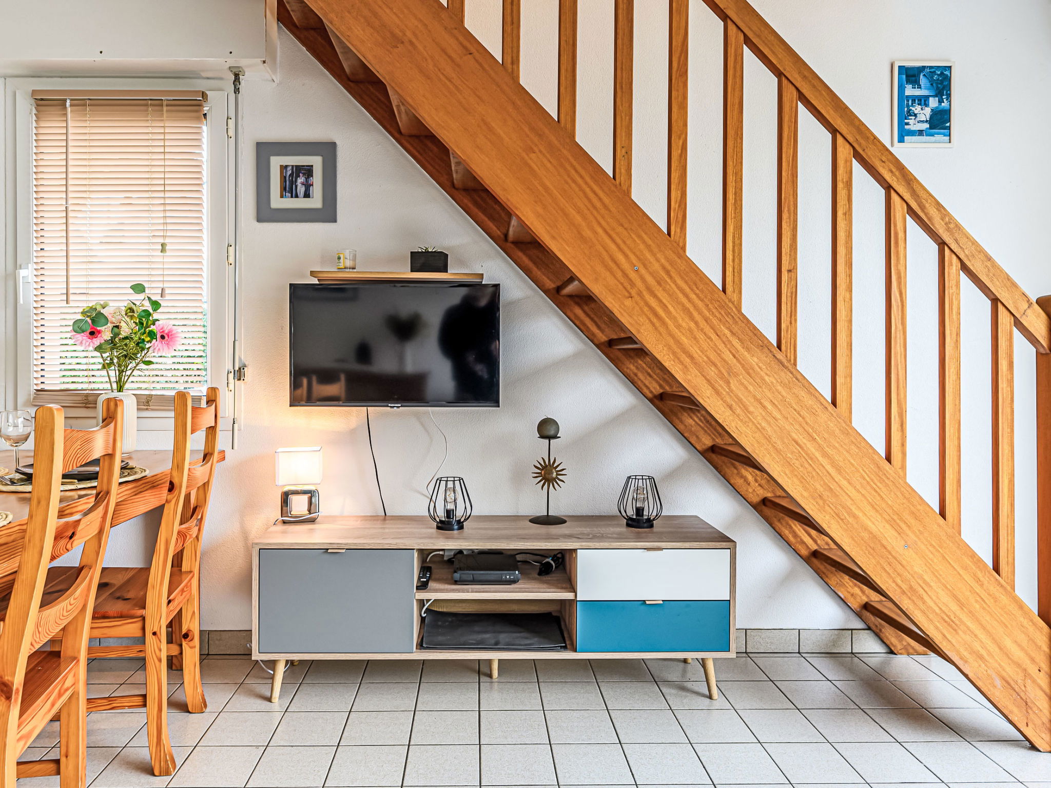 3-room semi-detached house 52 m2. Beautiful furnishings: living/dining room with panoramic window with TV (flat screen). Exit to the patio. Kitchen (dishwasher, 4 induction hot plates, electric coffee machine, combination microwave). Shower, sep. WC. Upper floor: 1 room (1 x 160 cm, length 190 cm). 1 room with 2 beds (90 cm, length 190 cm). Bathroom. Electric heating. Small terrace, small patio. Terrace furniture. View of the garden. Facilities: washing machine, children's high chair, baby cot. Internet (WiFi, free). At the house. 1 small pet/ dog allowed. 56186 000536 YC