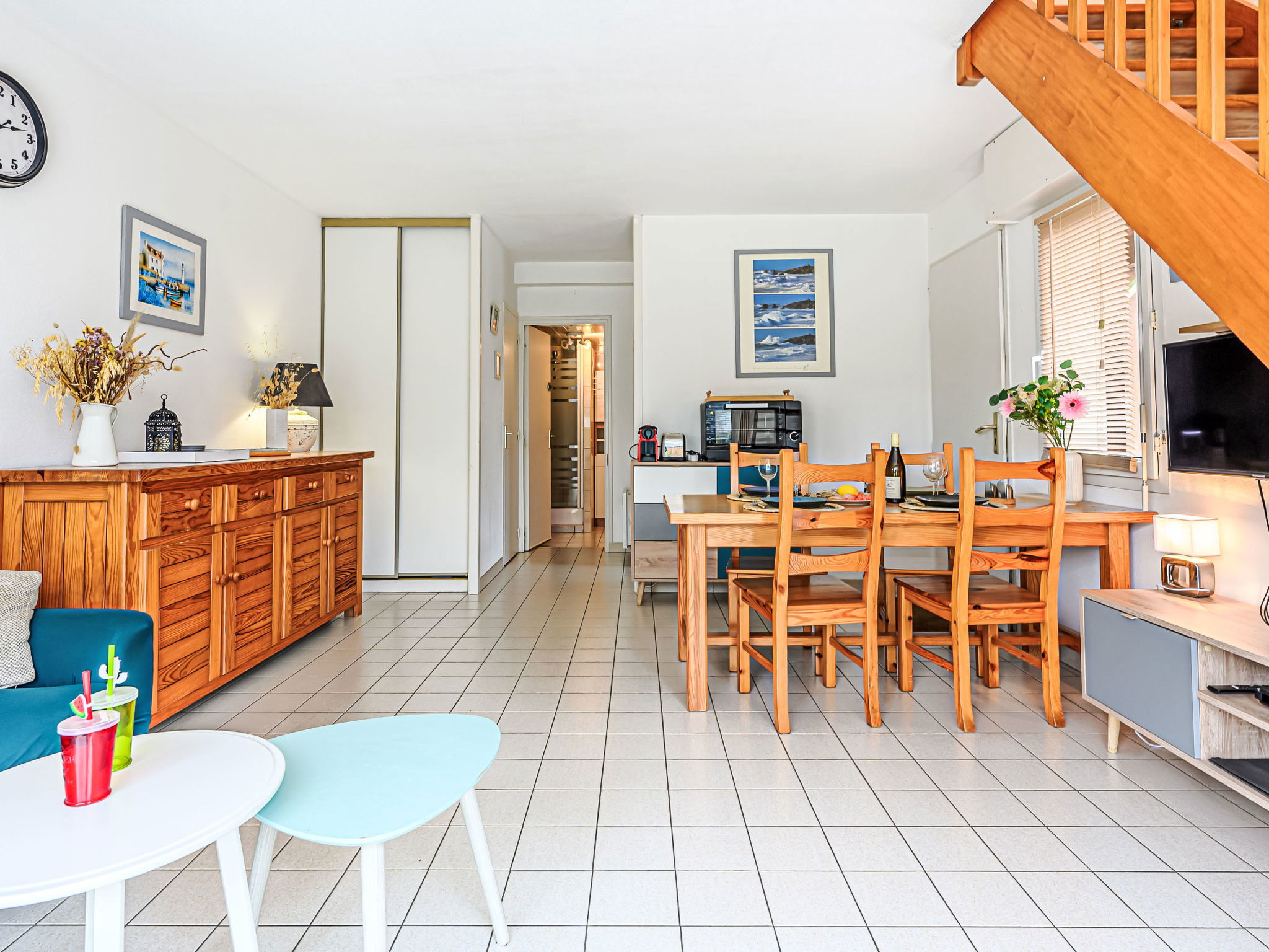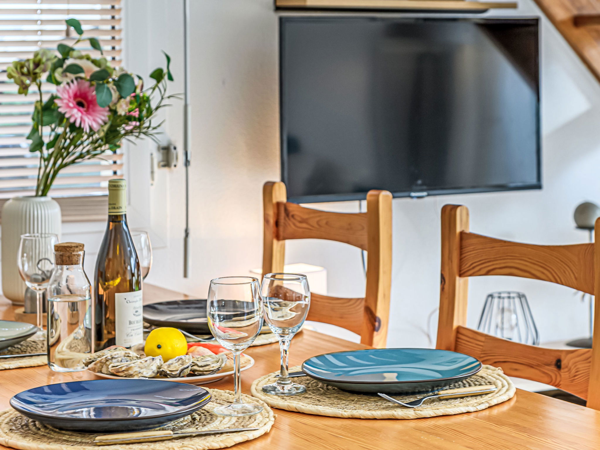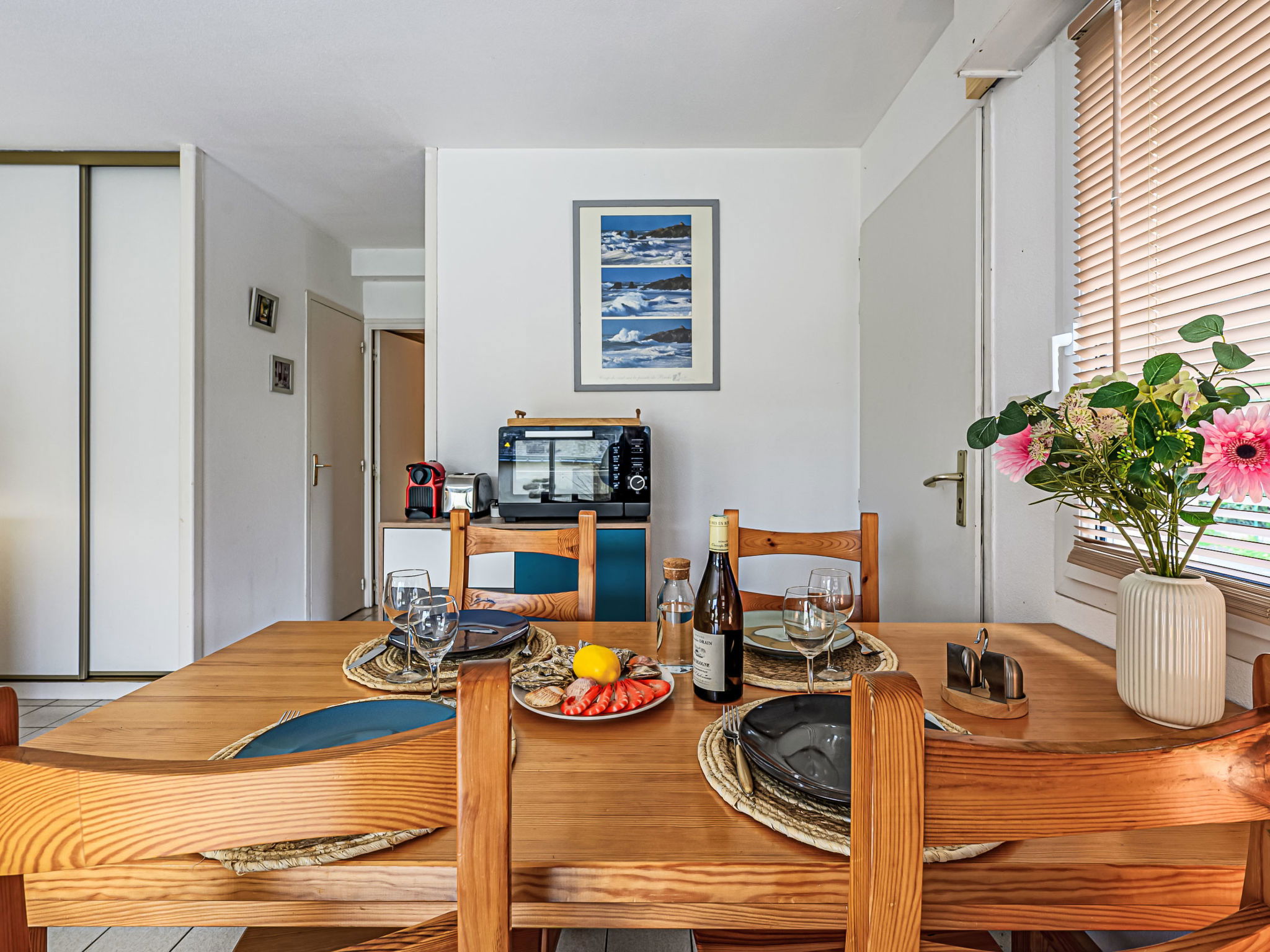 3-room semi-detached house 52 m2. Beautiful furnishings: living/dining room with panoramic window with TV (flat screen). Exit to the patio. Kitchen (dishwasher, 4 induction hot plates, electric coffee machine, combination microwave). Shower, sep. WC. Upper floor: 1 room (1 x 160 cm, length 190 cm). 1 room with 2 beds (90 cm, length 190 cm). Bathroom. Electric heating. Small terrace, small patio. Terrace furniture. View of the garden. Facilities: washing machine, children's high chair, baby cot. Internet (WiFi, free). At the house. 1 small pet/ dog allowed. 56186 000536 YC